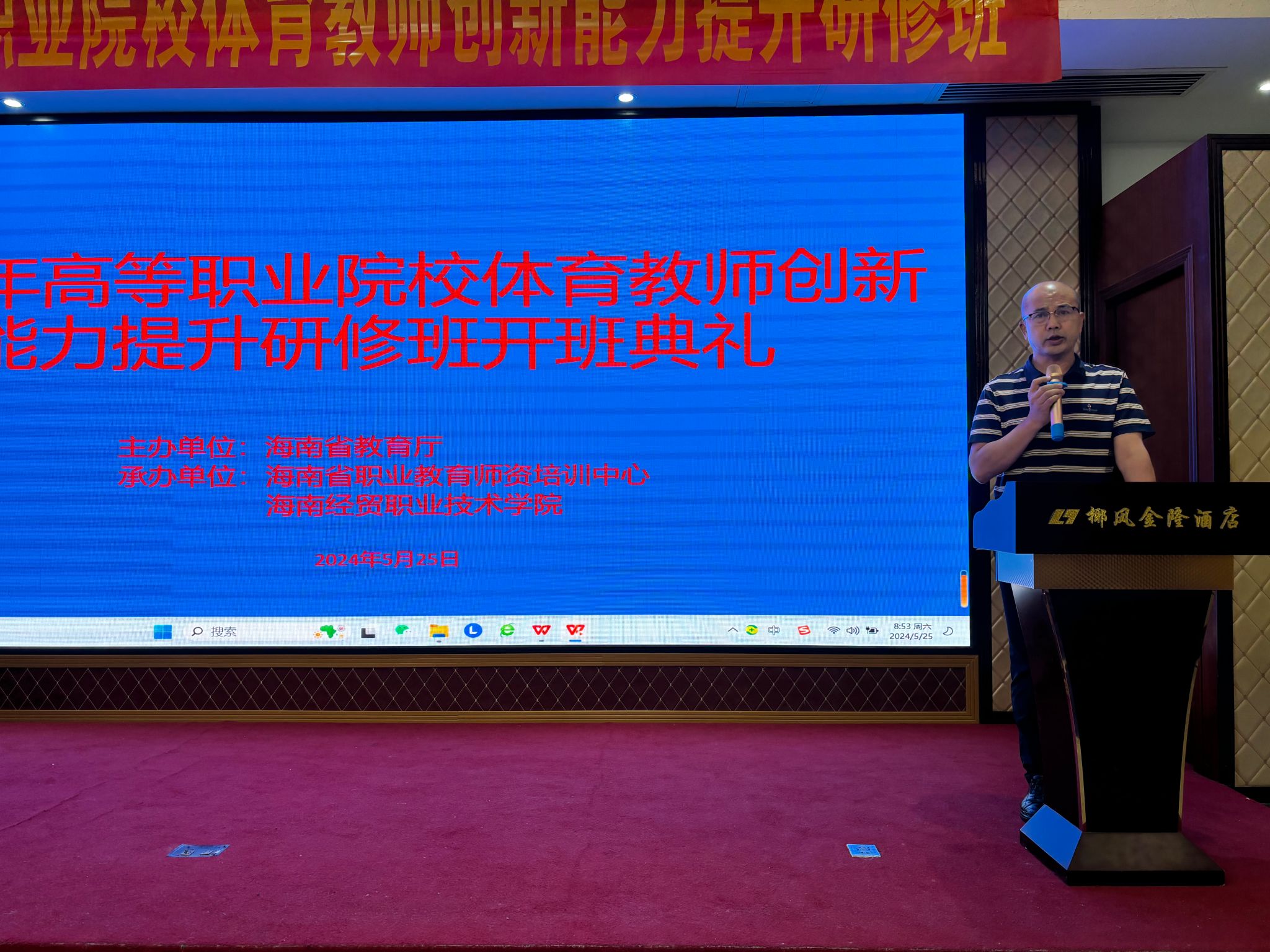 2024年5月25日至26日,由海南省教育厅主办,太阳成集团tyc234cc、海南省职业教育团队培训中心承办的2024年全省高等职业院校体育教师创新能力提升研修班在琼海市举办,顺利完成全部培训计划,圆满结束。来自全省14所高职院校共80名体育教师参加本次培训,太阳成集团tyc234cc经理胡友波主持培训会,太阳成集团tyc234cc体育与健康公司党总支书记曹迪伟出席培训会。